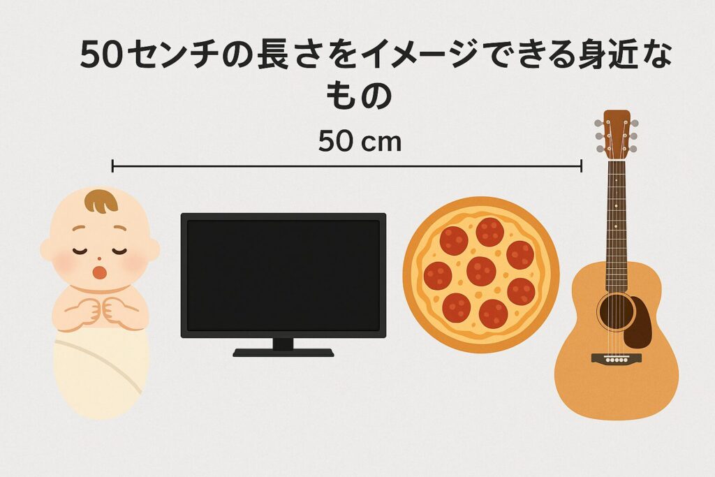 50センチと聞いても数字だけではイメージしづらいですが、赤ちゃんの平均身長や小型テレビの横幅、大きめピザの直径などを基準にすると分かりやすくなります。